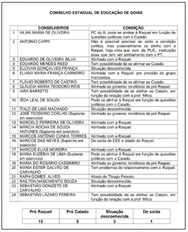 O atual Conselho Estadual de Educação, formado por 24 membros, é fortemente influenciado por Raquel Teixeira, que conduziu a maioria das nomeações dos seus integrantes(veja o quadro acima, elaborado para este blog por um dos integrantes do CEE). Sua jurisdição vai muito além da rede estadual de ensino, abrangendo também as redes municipais, as escolas particulares e faculdades. Uma vez lá dentro, a ex-secretária não teria dificuldades em se eleger para a presidência e a partir daí criar um bunker de resistência às políticas de Caiado para a Educação.